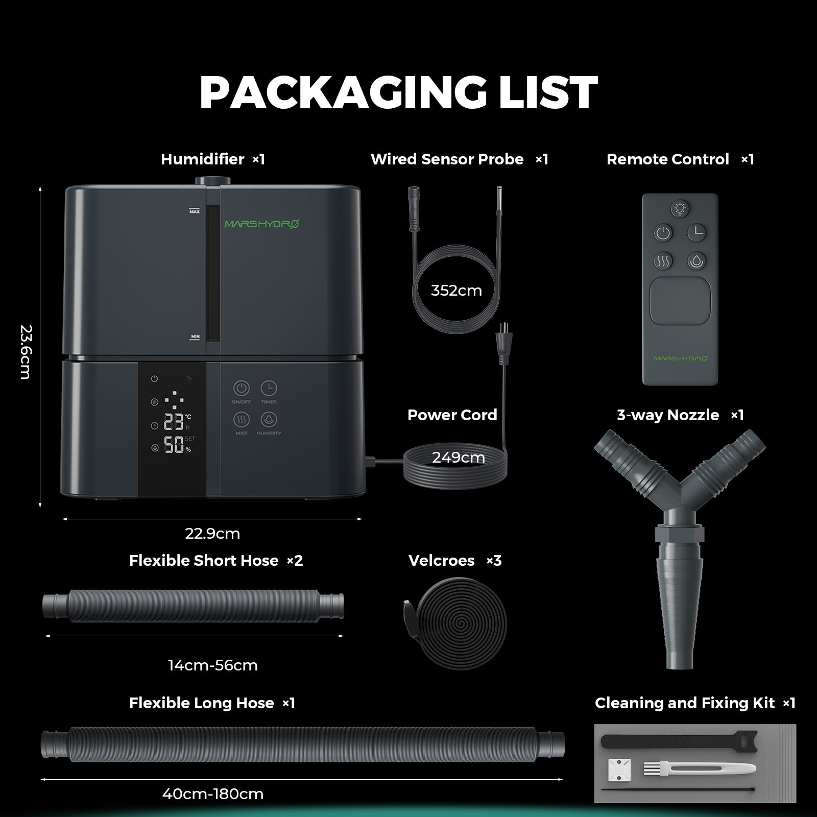Product includes: 5L humidifier x1, remote control x1, wired sensor probe x1, flexible short hose x2, flexible long hose x1, Velcroes x3, 3-way nozzle x1, tool kit x1